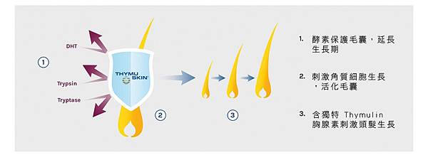 3 . 含有獨特Thymuskin高濃度胸腺胜肽可以有效刺激毛髮生長。